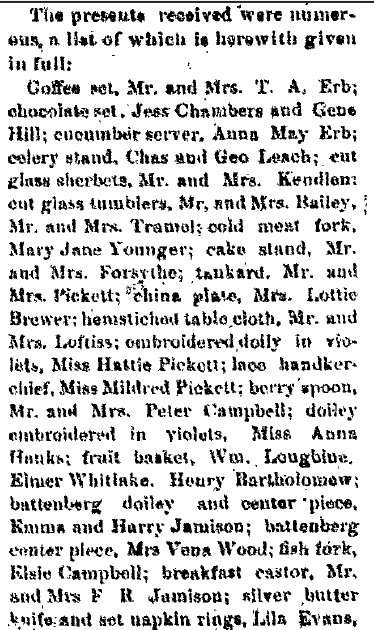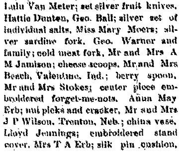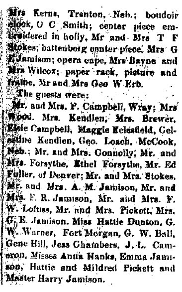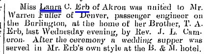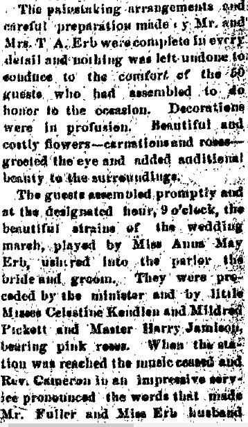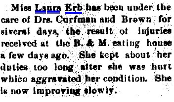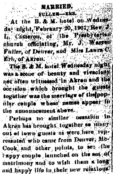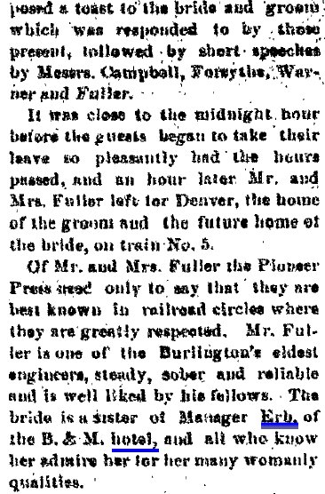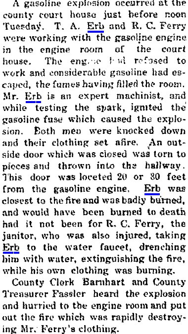 Among the valued citizens of Akron, Colorado, who contributed much to the growth and development of this community was Theodore Addison Erb, who for a number of years successfully conducted business interests here. His efforts were devoted to the management of a hotel but he was also engaged in the plumbing business, and it was through an accident while performing labors in this line that his life was terminated in 1914. Although it is now several years since Mr. Erb has passed away, his memory is still enshrined in the hearts of his friends, who respected him as an hon- orable and straightforward man of high qualities of heart and character. Theodore A. Erb was a native of Maryland, where he was born March 24, 1852, a son of Christopher and Mary (Shade) Erb, natives of Pennsylvania. For many years Christopher Erb followed agricultural pursuits in Virginia, to which state he had removed from Pennsylvania in his youth, and the Old Dominion remained his home until death called him in 1903. His wife had preceded him to the home beyond in 1896. Although born in Maryland, Theodore A. Erb was reared in Virginia, where the parental home was established, and he received his education in the home neighborhood. His schooling, however, was very limited, for he put aside his textbooks at the age of eleven and began to learn the blacksmith and wagon maker's trade. Becoming proficient in these lines, he continued to work at his trade in Virginia until 1885, when at the age of thirty-three he decided to seek the less thickly populated sections of the west in order to grow up with the country and improve his opportunities. He first removed to Trenton, Nebraska, where for five years he was engaged in the implement business but at the end of that time went to McCook in the same state, there giving his attention to the conduct and operation of a hotel which he successfully managed for three years. In 1893 he came to Akron, Colorado, and this city remained his home until his untimely demise in 1914, so that for over twenty-one years he was a resident of Akron, Washington county. Upon his arrival in this city he bought a hotel, to the operation of which he devoted his energies throughout the remainder of his life, although he conducted a plumbing business at the same time. He managed his hotel along modern ideas and put forth every effort to make his guests comfortable. His place therefore was well patronized and became favorably known to the traveling public. In the plumbing business Mr. Erb was also quite successful, deriving from this line of his activities a gratifying addition to his income. His death occurred from the effect of burns which he had received while doing plumbing work. His sudden death was not only a great shock to his immediate family but was deeply regretted by his many friends and the traveling public, who had come to know him as a reliable, trustworthy, honorable and pleasant man. Moreover, Mr. and Mrs. Erb operated a railroad eating house for about eight years but after the discontinuance of the same served meals in the hotel, this proving more satisfactory to the public. Subsequent to his death Mrs. Erb opened a cafe in connection with the hotel which she successfully operates, maintaining a rooming house in addition. On July 21, 1884, occurred the marriage of Theodore A. Erb and Susan S. Payne, a native of Frederick county, Virginia, where she was born in November, 1866, (In 1870 Berkeley County, West Virginia, John S. Payne is 35, Anna E.C. 25, with Mary O. 4, Susan S. 3. In 1880 Berkeley County, John is 45, Annie 40, Mary 14, Susan 13, Allen 10, and John 5. J. Summerfield Payne dying 1886 age 51, is buried in Berkeley County # 21731146. So is Ann Eliza Cunningham Payne dying 1912.) and a daughter of Summerfield and Susan (Timberlake) Payne, (one tree said Sue and Olivia Timberlake were sisters, daughters of David Timberlake 1771-1851 and Mary Davis 1777-1839) natives of Virginia, where the father followed farming all his life. During the war between the states he served as a lieutenant in the Confederate army, being active throughout the entire period of the war, and for four months he was held prisoner at Fort McHenry. His death occurred in August, 1885, while his wife died in 1866. (Susan F. Payne 1839-1866 is buried in Berkeley County, West Virginia # 42038153) To Mr. and Mrs. Erb were born two children: Anna M., who married Worth M. Miller, a newspaper editor of Ogallala, Nebraska; and Ruth G., who makes her home with her mother. Mr. and Mrs. W. M. Miller have two children, Supne, who is now eleven, and Marcellus Harwood, who is seven years of age. From that time when he took up his residence in Akron, Colorado, until his death Mr. Erb always cooperated with his fellow citizens in order to promote or support plans for the growth of his community either in a material or moral and intellectual way. He was interested in all matters concerning Akron and was ever ready by word, deed and means to render assistance to worthy causes. Fraternally he was a member of the Masonic order, the Independent Order of Odd Fellows and the Ancient Order of United Workmen, while Mrs. Erb belongs to the Eastern Star. The principles of brotherhood underlying these organizations always guided Mr. Erb in his conduct toward his fellowmen, to whom he ever was kind and helpful. His religious faith was that of the Presbyterian church, in the work of which he took active part, and politically he was a democrat. Although more than four years have passed since death claimed one of Akron's most useful and most respected citizens, the memory of Theodore Addison Erb lives in the hearts of his fellow citizens, for all recognized in him a loyal American, a successful business man of honorable principles and a true, faithful friend who would never fail in an emergency. |