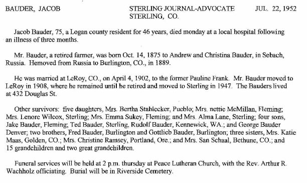 Mrs. Christena Bauder died Friday, April 25, 1919, aged 78 years and 8 days. Her maiden name was Christena Ottenbacher. She was born in South Russia, near Odessa, on the 17th day of April, 1841, where she was married to Andrew Bauder on the 11th of September, 1862;to which union was born eleven children; seven boys and four girls. Two boys and one girl passed away in infancy. The family came to America during the fall of 1888 and settled in this county some 15 miles northwest of Burlington, near the Lostman creek, where they resided on the homestead for 29 years. On the account of old age and feeble infirmities, last October they went to reside with their son Fred, with which they had lived for six months. During the 25 days of January 1919, she had a stroke of paralysis which afflicted the left side. On the 10th of April they moved into their new home on the Samuel Schaal farm, where for two weeks Grandmother Bauder lived until the 25th day of April when she passed away peacefully and was buried in the Lutheran church cemetery on Sunday, April 27. Rev. Gus Adolph performing the funeral rites. She leaves to mourn their loss her aged husband, five sons and three daughters, together with 46 grandchildren and seven great grandchildren, all living in Colorado. The five sons and her son-in-law, Mr. Samuel Schaal were the pallbearers. The floral offerings were beautiful and lavish in display. ------------------------------------- Last Thursday, July 14, 1921 Andreas Bauder Sr. died at the home of his daughter, Dorothea, and her husband, Samuel Schaal. He was born in South Russia on the 4th day of December 1838. He was baptized and confirmed in the Lutheran church, received a good Christian school education and prepared himself, by an apprenticeship of several years for the vocation of a blacksmith. In 1862 he was united in marriage with Christina Katherina Otenbacher. Three of his eleven children died in their infancy in Russia. Since this blessed country of ours exhibited to him, as well as to thousands of others in the old country, a sphere of usefulness and enterprise, he came to America with his family and landed in Baltimore in 1889. He was one of the first settlers near Bethune and went thru all the troubles and hardships of establishing a new home on the virgin soil of a new country. There was no crop in the first four years of his farming, but after years of hard work he saw his labor rewarded. He was one of those early settlers, who by their hard work and endurance – strange as it seems – helped to build up the city of Burlington and to enrich our country. In 1912 he celebrated with his wife the golden jubilee of their wedding. Since 1918 he was staying with his daughter, Dorothea. His wife died in 1919. He was esteemed by everyone who knew him. He died a peaceful death, being 82 years, 7 months and 10 days of age. He leaves to mourn his death eight children: Andreas Bauder, Gottlieb Bauder, Friedrich Bauder, and Dorothea Schaal, of Bethune, Colorado; Johann Bauder, Brighton, Colorado; Katharina Mase, Golden, Colorado; Jacob Bauder, Sterling, Colorado; Christina Elein, Ft. Morgan, Colorado; his sons-in-law and daughters-in-law, 45 grandchildren, 14 great-grandchildren, 1 sister and a large circle of friends. His earthly remains were laid to rest Sunday, July 17th, in the cemetery of the Lutheran Immanuel congregation near Bethune. Services were conducted by the Rev. Gehrect. Many friends of the departed attended his funeral. Undertaker N. R. Brown conducted the funeral. ------------------------------------------------ Andreas # 30089056 and Chriesten 1841-1919 # 30088940 are buried in Bethune. |