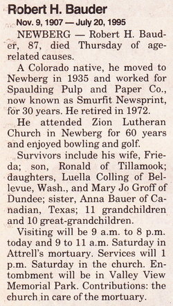 Aunt Tina was 7 1/2 years old when she came, with the rest of the family to this country. She was the youngest, however, she had her work to do just the same as the rest. She spoke little of those early years. When she was 14 or 15 she went to Denver, Colorado, where her brother (Uncle John) was living. She soon found employment in a Jewish home in Denver. This job was more like a governess job. These people helped her to read and write the English language correctly. These people also taught her how to do most everything--speech, actions, cooking, entertaining; they even brought a seamstress into the home that taught her to sew. She became a very refined lady. About 1905, (Charles Kelin married Christina "Bander" in Denver May 19, 1904.) she married Charles Klien. His folk owned the Gilpin Hotel in Blackhawk, Colorado, and Aunt Tina and Uncle Charles ran the hotel for a couple of years. One day a man came in and she heard him talking German so she answered him in German, then they both talked English. He told her that he had never heard a German who could talk such perfect English without even a brogue. There was a gold rush boom at that time. Wages were good and they saved enough money to buy a five-acre place near Arvada, Colorado. (In 1910 Arvada, Charles "Klein" is 34, a traveling salesman, born in Colorado., Christina 28, Colorado.) They built a lovely brick house, bought a cow and a horse, and raised a lovely garden, however, they didn't stay there long. They moved to Ft. Morgan, Colorado. In 1917, Aunt Tina divorced Charles Klien and he died a few years later. (Charles 1875-1918 is buried iN Jefferson County, # 72422891.) For several years, she remained in Ft. Morgan, rooming and boarding school teachers. (In 1920 Denver, Christine Klein is 35, widowed, a cook for the James Jackson family) In about 1926 she made a trip west. She visited her nephew, John and family, who lived south of Portland, Oregon. During this trip she met Dan Ramsey. She went back to Ft. Morgan and stayed about a year and sold out. She then went to Portland where she married Dan Ramsey. They lived in and around Portland, where he died in the early 1940s. Aunt Tina continued to make her home in Portland. For a time she looked after an apartment house for her apartment. In May 1965 she fell on the curb and broke her hip and was hospitalized for eight weeks. After convalescing she went to Newberg to stay with her nephew, Robert Bauder. Later she retired to the Baptist Home for the aged, having surgery again in 1969. Her remaining months were spent in the Eastpark Care Home. |