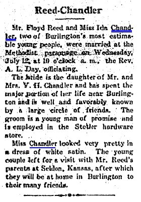 "Elizabeth Ellen YARNELL married 3 Oct 1861 in Ada, Hardin County Ohio to Virgineus CHANDLER. They had a daughter born 1881 Shelbyville, Illinois."Virgineus H. Chandler cash-claimed a quarter in 24, 7S, 44W in 1891, and proved up another in sections 8 and 17 in 1897.