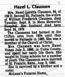 She married John Peter Claussen November 25, 1920 in Wray, Yuma Co., CO; born October 8, 1888 in Iola, Allen Co., KS; died August 19, 1979 in Port Orchard, Kitsap Co., WA.