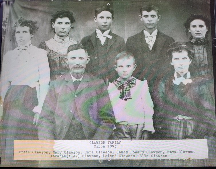 Abraham Clawson in 1900 was in Payne County, Oklahoma, born August 1848 married 24 years to Ella April 1855, both born in Indiana, with Howard May 1881 Illinois, Thos Earl, July 1886 Nebraska, Effie Jun 1889 Colorado, and Leland May 1893 Colorado.