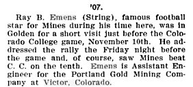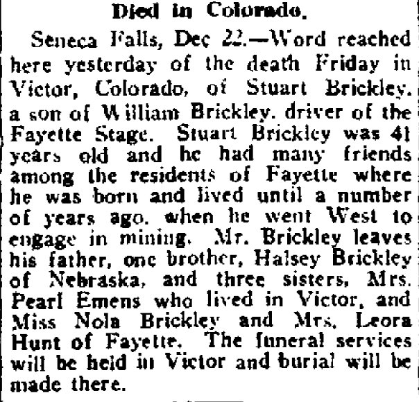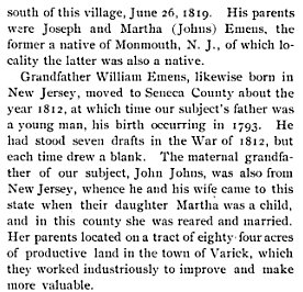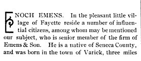 Syracuse New York, July 2, 1910 SENECA FALLS, New York Five days after passing the ninety-first anniversary of his birth, Enoch Emens, one of the best known and most respected residents, afternoon at his home in Varlch. Mr. Emens had spent all of his life in that town and had a wide circle of fast friends. He was born in Varied on June 26, 1819. He grew up in that vicinity and married Eliza A, Van Kiper, who was also a resident of that community. They had six children, five of whom are now living, Miss Martha Emens of Fayette, Olin E. Emens of this place, Humbolt Emens of Victor, Colorado, Prof. Edgar A Emens of Syracuse and Fred Emens of Fayette. Mr. Emens was always an active man and for at least twenty years was a mem..... ------------------------------------------------ Olin E. Emens was born August 25, 1857 to Enoch, and married Emma B. Burroughs, daughter of William and Lucinda (Beary) Burroughs, in 1881. So Enoch and Humbolt, brothers, married cousins. |