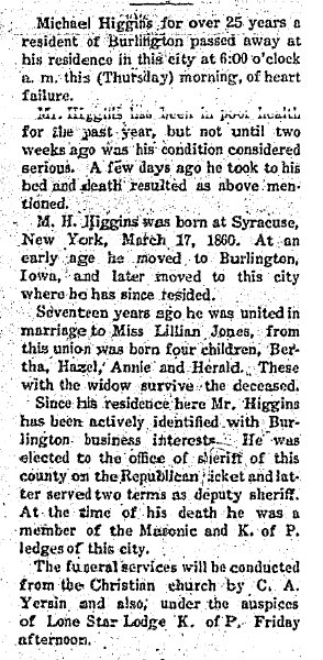 Michael 1860-1911 is buried in Burlington, and Lillian W. (Jones)(Higgins) Pilling 1867-1962 is buried in Lawrence County, Missouri, # 33514151.
