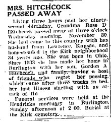 Funeral services were held Monday, March 8, at Draucker Mortuary in Ogallala for Ola Winifred Cox, 94, of Ogallala, who died March 4, 1982, at Indian Hills Manor in Ogallala. Rev. Eschliman conducted the services. Burial was in the Ogallala Cemetery. She was the mother of Howell W. Cox of Fort Calhoun and the grandmother of Kathryn (Mrs. Guenther) Schwartz of Blair. Ola Winifred Freitag Cox was born July 14, 1887, in Saline County, Nebraska, to Johann (John) and Johanne (Johanna) Glander (Friday) Freitag. She attended school at Western, Nebraska, through the eight grade and then cared for the ill and newborn until going to eastern Colorado where she homesteaded near what is now Kirk, Colorado. She married Homer Waldo Cox on April 25, 1915 in Burlington, Colorado. They lived on the homestead until their son, Howell, was of school age and then moved to Ogallala, Nebraska. She was a member of the Methodist Church, a lifetime member of the United Methodist Women, and had been a member of the WCTU for many years. She was a member and historian of the Ogallala Federated Woman's Club for many years. She was preceded in death by her husband, Homer, in February, 1961; two sons, Glenn Wendell, at birth; and Paul Winfield in February, 1936; her parents; four brother; and four sisters. She is survived by one son, Howell Winfred Cox, and his wife, Beverly, both of Fort Calhoun, Nebraska. Two grandchildren, Curtis Wayne Cox, Oxen Hill, Maryland, and Kathryn Ann (Mrs. Guenther L.) Schwartz, two great-grandchildren, Christopher Paul and Elizabeth Shanti Schwartz, all of Blair; one brother, Curtis Roy Friday, West Point, Mississippi; and nieces and nephews also survive her. Draucker Mortuary in Ogallala was in charge of arrangements and services. |