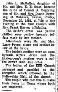 Longtime Kit Carson County residentt Opal F (Degering) Brachtenbach, passed away February 20,2006 at the Kit Carson County Memorial Hospital in Burlington. She was 82 years old. Opal was born on August 27,1923, on the family farm north of Stratton, Colorado to Benjamin and Amelia (Schroeder Degering. She was the youngest of three children. She attended country school, until the family moved to Avoca, Arkansas in the 193's. The family then moved to Orange, California. They returned to live north of Stratton. Opal met, and later married Joe Brachtenbach on January 26,1942. They lived in several places north of Stratton, moving to town a short time, before purchasing the home place. In 1992, they moved off the family farm to Burlington. Together they raised six children; Barbara, LeRoy, Gary, LaDonna, Janell and Shirley. Opal enjoyed her time as a homemaker, and was a constant help with all the farming and ranching. Joe and Opal would work hard all week, so on weekends, they could travel the country side antiquing. She had a wealth of knowledge about so many of the collectables. She passed this knowledge on to her children and each of them have a passion for their own collections. Joe and Opal met countless others who shared their antiquing interests. You could ask her where they purchased some item, and Opal would not tell you how much it cost , but who they purchased it from and where they lived. She had two hobbies that she enjoyed after her children were raised, stain-glass and bowling. Opal was preceded in death by her parents and a brother Duane. She is survived by her husband Joe, and her children Barbara Eisenbart, and her husband Tom of Goodland, and their children John Eisenbart, Debbie Stegman and Sandra Walker, Leroy and Susie Brachtenbach of Stratton and his sons Zane Brachtenbach and Eric Brachtenbach, Gary Brachtenbach and his wife Cynthia of Stratton, and their children Clayton Brachtenbach and Lindsey Brachtenbach and LaDonna Anderson of Fruitland, Florida, and her children Jimmy Anderson, Bobby Anderson and Crystal Anderson; Janell Wood and her husband Brian of Ordway, and their sons Michael Wood and Matthew Wood; Shirley Jamagin and her husband Kevin of Seibert, and their sons David Jamagin and Ryan Jamagin; and her sister Gladys Mathison of Rosemead, California and a sister-in-law Carmileta Degering. Opal is also survived by eighteen great grandchildren and a host of relatives. Funeral services were held on Friday, February 24, 2006 at 2:00 PM at the Love Funeral Home in Burlington, with Pastor Bob Strauch officiating. Burial followed in the Claremont Cemetery in Stratton. |