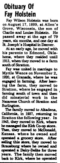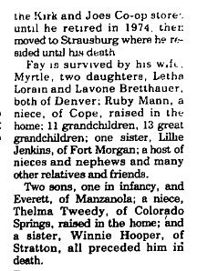 The Kirk items of November 28, 1968 said that Sandra Boyer had adopted her baby sister. Sandra "was married recently and will not be able to come here for the shower." Ruby Coriene Mann, age 83, of Chambers, Nebraska, formerly of Kirk, Colorado, passed away on Saturday, July 4, 2015, at the Good Samaritan Care Center, in Atkinson, Nebraska. She was born on October 24, 1931, in rural Kit Carson County, near Bethune, Colorado. At the age of 6, her mother passed away due to complications of child birth. Feeling unable to care for the needs of 5 young children, her father made arrangements for close family members to raise them. Ruby and her sister, Thelma, were sent to live with Uncle Fay and Aunt Myrtle Holstein and family in Stratton, Colorado. To ensure the children remembered each other and their father, a yearly reunion was held. When Ruby was around 14 years old, her father died. The family lived at Stratton while Ruby attended elementary and middle school. They then moved to Kirk so Uncle Fay could manage the grocery store. Ruby helped out by clerking and stocking shelves as she attended high school where she met and became high school sweethearts with her future husband, Raymond Mann. They were married March 20th, 1950. To the union, 5 children were born: Carol (1950), Kenneth (1952), Karen (1955), Kendra (1958), and Kellie Jo (1963) . Ruby is survived by her daughters Carol Mattheis and husband, Ken of Colorado Springs, Colorado; Karen Sladek and husband, Ed of Chambers, Nebraska; Kendra Mann of Kirk, Colorado; Kellie Jo Mann of Garden City, Kansas, grandchildren Jason Sladek and wife, Emily of Hamilton, Montana; Jonathan Sladek of Chamber, Nebraska; Jeremy Sladek and wife, Charissa of Chambers, Nebraska; Jenna Welborn and husband, Jeremiah of Stuart, Nebraska, great grandchildren Madden and Stryker Sladek of Chambers, Nebraska and Connor Welborn of Stuart, Nebraska, one brother Archie Yelek of Safford, Arizona, and special family friends, Tim Kieffaber and wife, Mary of Tyrone, Oklahoma; and Kevin Adler and wife, Pam of Kaukauna, Wisconsin. She is preceded in death by her parents, Frank and Cora Yelek; her second parents, Fay and Myrtle Holstein; her husband, Raymond Mann; her son, Kenneth Mann; her sister, Frances Gray and husband, Bob; sister Sara Sutton and husband, Frank; and sister Thelma Tweedy. A graveside service was held at the Kirk Cemetery July 17, 2015 at 10:30 a.m. Memorials will be to cancer research and the Idalia School Library as she loved to hear about the children loving books. Arrangements were made by Schmidt-Jones Funeral Home. |