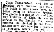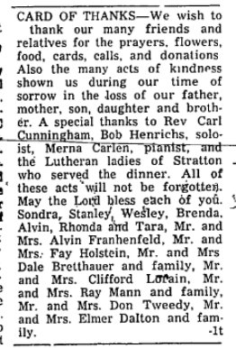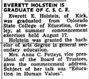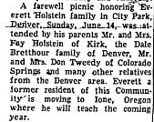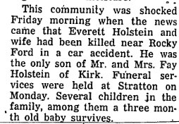 Both Everett Holstein, former Ione High school principal, and his wife, Joan, died as a result of a one-car accident two miles west of Rocky Ford. Colo., on Friday, May 17, according to reports received here. Holstein was 43 and Mrs. Holstein was 39. Holstein apparently died almost instantly after his auto went out of control, struck a concrete abutment and crashed into a ditch. Mrs. Holstein died two hours later. It took firemen nearly two hours to extricate her from the wreckage. The report indicated that Holstein apparently fell asleep while the couple was westbound towards Manzanola at an early morning hour. None of their seven children was with them at the time of the accident. Their youngest child, Tara, was born just 1? weeks ago. Oldest of their child ren is Sandra, who is 21. Others are Stan, 20, who graduated with the Ione High class of 1966: Wes, 19: Brenda, 13: Alvin, 9; and Rhonda, 6. Sandra and Stan are students at Colorado State College, Greeley, and Wes is in the army at Ft. McClellan, Alabama. Holstein was principal at Ione for two years, coming in the fall of 1964 and leaving in the spring of 1966, being succeeded by the present principal, ??? Beggs. Holstein currently was principal of Manzanola High school. Principal Beggs, who received the information here about the fatal accident, said that any who wish to get in touch with the family or to send messages of condolence could send them to Stan Holstein, Manzanola, Colo. 81058. It is a small town, and this is a sufficient address. June 13, 1968