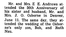 Their daughter : Maxine T. (Osburn) Duden, 73 died September 22,1996 in Limon, Colorado. Services were officiated by Rev. Brad Cowger of Monument Hill Church on September 25th at Hendricks - Love Funeral Home in Burlington, Colorado. Maxine was laid to rest near her father, mother and sister (Irene Buhr), in Claremont Cemetery at Stratton, Colorado. Paul Bearers included Jim Rau, Danny Rau, Tom Rau, Bill Rau, Skye Rau, John Rau, Glenn Pence and Rich Buhr. Maxine was born July 31,1923 near Bethune, Colorado to Ada and Richard Osburn. She is survived by her four sons, Jim Rau and Bill Rau of Monument; Tom Rau of Collbran, and John Rau of Guthrie, Oklahoma, 13 grandchildren, and four great-grandchildren; and Merrell Jaques partner and the rest of the loving Jaques family of Arriba, Colorado. |