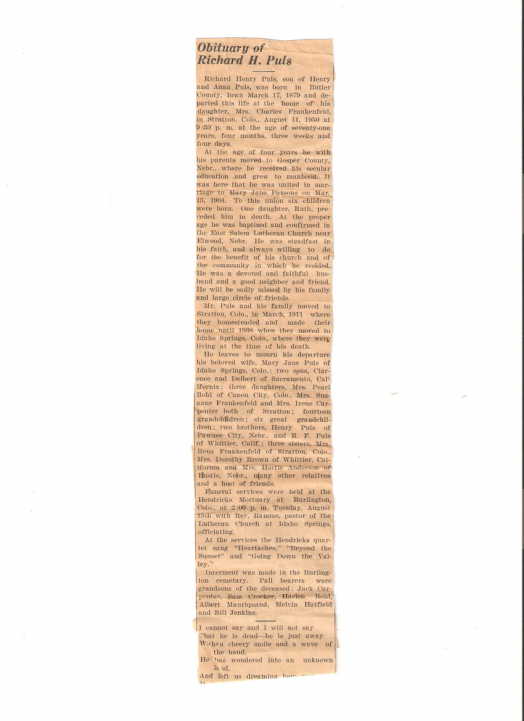 Suzanne Frankenfeld died Sept. 21, 2004, in CaƱon City, CO. She was born on Feb. 16, 1909, in Elwood, Neb., to Richard and Mary (Parsons) Puls. She was married to Charles Frankenfeld. Mrs. Frankenfeld is survived by one daughter, Dolores Crocker; one sister, Pearl Bohl; 1 grandchild; 3 great-grandchildren and 5 great-great-grandchildren. She was preceded in death by her parents; her husband; one grandson, Monty Crocker; two sisters, Irene and Ruth and two brothers, Clarence and Bob. Cremation was through Funeral & Cremation Care of Colorado. |