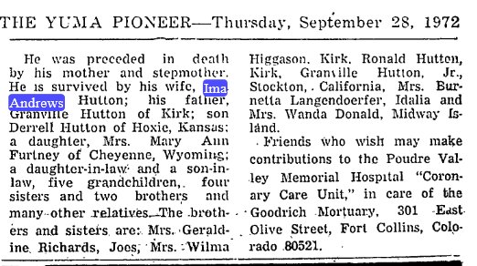 Their son Derrell Hutton 1937-2004 married Shirley may Salvador in Yuma, and is buried in Oakley, Kansas #E 37479601.