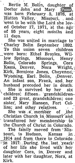 On the same page as Mary Paine in 1920 Kit Carson County, Charley Bolin is 47, with Bertie M. 43, Charley H. 2, Nora M. 16, ora M. 16, Bernice A. 12, and James E. 8, all born in Missouri. Charley's mother Sarah M. Bolin 70 widwowd born in Tennessee is with them.