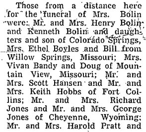 1939 "Earl Bolin brought his mother, Mrs. Bertie Bolin, down from Fort Collins Wednesday to the Harlan Pratt home where they were present for Thanksgiving dinner. Other guests that day were Mrs. Cora Hobbs and children an dMrs. and Mrs. Claude Paine and children.. Mr. Bolin returned to Fort Collins Thursday eveing. Mrs. BOlin stayed here for a visit with her children whol live here.