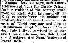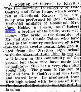 March 1941 "The Claude Paine family are moving to their new home south of Vona. Frona Belle will stay at the E. Godfrey home and finish school in the Kechter district. Mr. and Mrs. Francis Finley will move to the farm vacated by the Paine family. The place is now the property of Bill Kechter."