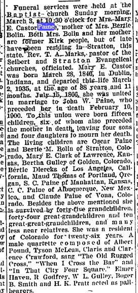 1940 "Mrs. Claude Paine received word Thursday of the illness of her mother, Mrs. Bell, of Denver. She is past 80 years of age and has pneumonia. Mr. Paine and son, Robert, took Mrs. Paine to Denver that night. No hope was given for the mother's recovery when Mr. Paine and son came home.""