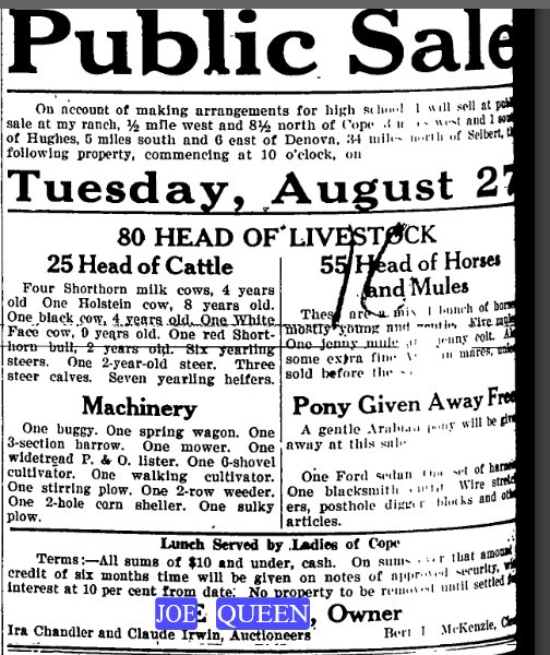 1943 Joes items in the Yuma Pioneer "Mrs. Joe Queen of Cope moved here Saturday to take charge of the telephone work. Mrs. Pryor had her goods moved to Yuma Saturday and left for her new home Wednesday."