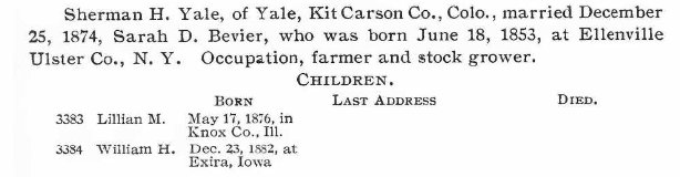 William, born December 23, 1882 at Exira, Iowa, a farmer, died July 23, 1946 in Andrews County, Missouri, to be buried in the I.O.O. F. Cemetery, Nellie Yale the informant. She said William's parents were Sherman H. Yale of Galesburg Illinois and Sarah Bevier of New York.