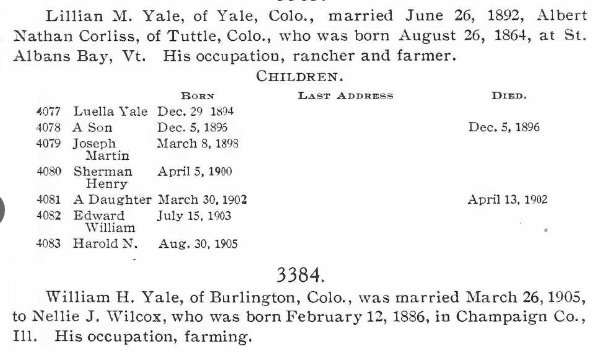 William H. Yale married Nellie J. Wilcox on March 26, 1905, recorded in Kit Carson County.