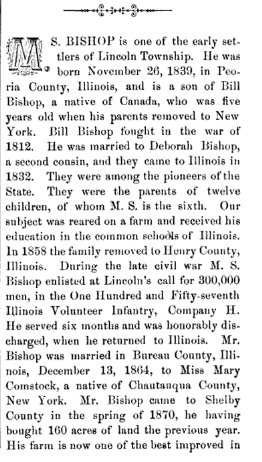 In 1860 Henry County, Illinois, V. Bishop is a coal miner 63, born in Canada, with Deb 47 in Connecticut. Moses is 20, Lydia L. 15, daughter D. 12, son D. J. 9, son A. G. 7, and a one monthe old daughter.