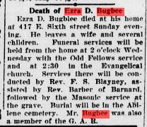 Ezra is buried 1840-1920 in Abilene, Kansas # 52094176, with Saraj J. (Frentz) Bugbee 1843-1928.