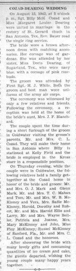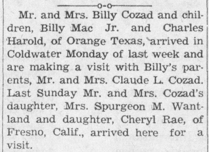 Verna's parents: Last Tuesday, March 14, 1922 was the 50th anniversary of the marriage of Mr. and Mrs. F. A. McKinney of this city, and in honor of the event a happy gathering of relatives was planned for that day at Mr. and Mrs. McKinney's home in Comanche County, Kansas. The plans were well carried out, only one occurrence hindering the complete enjoyment of the day, and that was the extremely unfavorable condition of the roads, which made it impossible for a number of the relatives to be present. But those who live in town, Floyd McKinney and family, Mr. and Mrs. O. J. Mark and Dale Mark, were there and helped to make the occasion one long to be remembered. A fine dinner was enjoyed and a happy time was spent together. The children who could not be present are: W. A. and Will McKinney of this county, Mrs. Verna Cozad of Attica and Mrs. Fanny Padgett of Geary, Okla. One daughter, Mrs. Fletcher, died in Colorado only a few months ago. Mr. and Mrs. McKinney have 20 grandchildren. They are the parents of seven children, and six of that number are living. It is not often that so large a percentage of the children live to help celebrate the Golden Wedding Anniversary of their parents. If Mr. McKinney lives until the 2d day of next July, he will be 75 years of age. Mrs. McKinney will be 71 in August. It was on March 14, 1872 at Paxton, Sullivan County, Indiana, that F. A. McKinney and Miss India Shake were united in marriage. Twelve years later, or in the year 1884, the family moved to Kansas, settling on a farm about six miles southwest of Attica in Harper co., paying $1000 for the quarter of land. There they continued to make their home until they came to this county about fifteen years ago. Mr. and Mrs. McKinney are well acquainted with the hardships and the sacrifices of pioneer days. They stayed with the country and labored on and they have been successful in building up a good home and have done their full share in developing the country. They are ranked among our best citizens, and all unite at this time in extending to them sincere congratulations upon their having reached the 50th mile stone along the pathway of their married life, and to them there is extended the sincere hope that many more happy wedding anniversaries may be theirs to enjoy. ------------------------------------------------ Mrs. J. E. Padgett, mother of Mrs. Wayne Beitler and a sister of Will McKinney, Mrs. O. J. Mark and Mrs. C. L. Cozad of Coldwater, passed away at her home in El Reno, Oklahoma, on July 24, 1944. Funeral services were held in El Reno on Thursday of last week. Those from this county who attended the funeral were Mr. and Mrs. Beitler, Bill McKinney, Mrs. Cozad, Mrs. Sadie McKinney, Russell McKinney and Mrs. Mary McKinney. Burial services were held in Attica, Kansas, on Friday and were attended, also, by Mr. and Mrs. Harold Ellis, Robert and Dorothy McKinney, Mrs. Bill McKinney and daughter, Miss Vera and C. L. Cozad. At the time of her death, Mrs. Padgett was _2 years of age. She was a daughter of Mr. and Mrs. F. A. McKinney, now deceased. Her husband passed away three months before her death. |