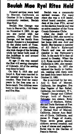 Beulah Mae George married Lloyd A. Ryel 1892-1945 buried in Yuma Colorado, and Beulah 1900-1982 is buried in Merced, California, per # 25871204.