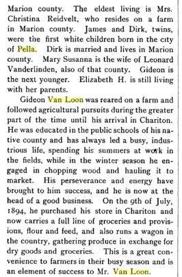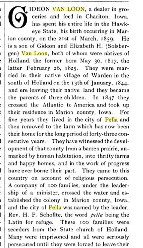 In 1857 the Fourth of July band leader was D. Van Loon, father of Wm. Van Loon and brother of Gideon Van Loon who came from Holland to Pella in 1849, and lived 2 miles west of Pella. D. Van Loon was born May 30, 1819 in the city of Utrecht Netherlands. He left that place and landed in 1855 at New Orleans, came up the Mississippi to Keokuk where he stayed that winter and came to Pella in the spring of 1856. In the fall of that year they organized a brass band. That is the celebration mentioned in this book for 1857.