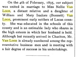 1890 Oakley Graphic "David VAN LOON celebrated the 71st anniversary of his birthday at his home eight miles southeast of Oakley on Decoration Day in the presence of 9 children and 17 grandchildren. He felt as young as in the days of 1830-31, when a war broke out between Hollad (sic) and Belgium. He was in that 15 days battle when two regiments of Dutch Hussars held 75,000 French soldiers for 15 days at Ft. Yetchel. May a wise providence save him to live among his children and grandchildren for many years to come. Mr. VAN LOON is one of Logan county's oldest settlers. He came here in the spring of 1880 with four children, Henry, Paul, Elizabeth and Hattie, and thirty cows. There were then plenty of buffalo bones and scattered bands of Indians. He is a successful cattle man at present.