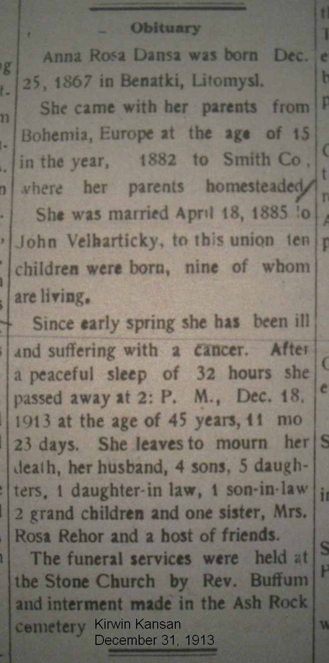 In 1900 Rooks County, Kansas, John is farming, born Feb 1864 in Bohemia, married 16 years to Anne Jan 1868, also born in Bohemia. Alvin 14, John 11, Anna 8, Rosa 4, Martha 2, and Frances five months were all born in Kansas.