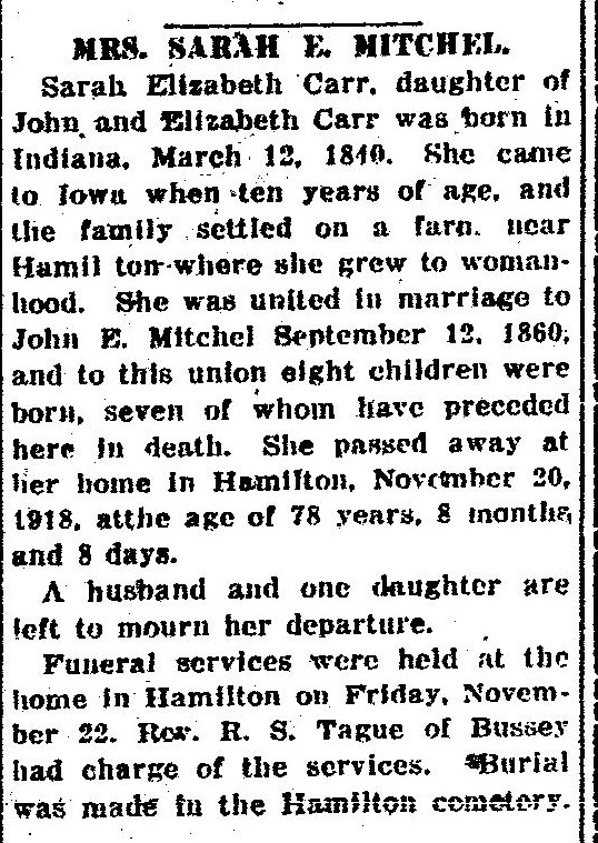 Mary's brother Harvey Carr 1847-1933 is buried in Marion County, Iowa # 62323206.