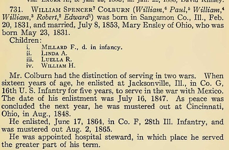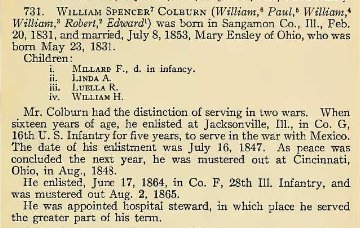 In 1870 Sangamon County, Illinois, William Colburn is a carpenter, with Mary, both 39. Malinda is 14, Louella 12, and William H. 1.