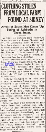 Sidney, Nebraska 1938: District Judge Nisley sentenced Charles and Richard Sypherd to four years each in the penitentiary on charges of burglarizing a farm home north of Sunol last August. Authorities said they would release James Sypherd, brother of Charles and Richard, and a 19 year old girl.