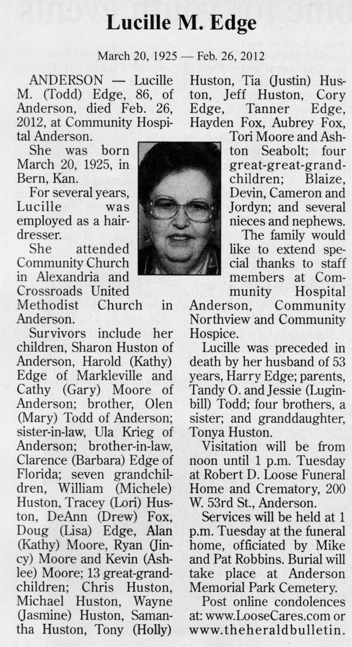 Lucille M. (Todd) Edge is buried in Anderson, Indiana.