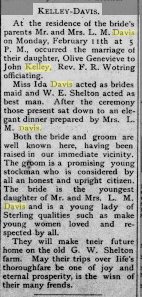 1903 Fort Morgan " Miss Ida Davis of Snyder, is staying with her sister Mrs. Kelley at present."