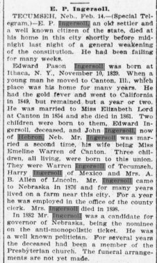 In 1880 Johnson County, Nebraska, Edward Ingersoll is 51, Emma 50, farming.