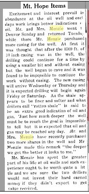 May 1918 Hugo, Colorado "Not much news just now about the oil well. Mr. and Mrs. Menzie made a trip Tuesday to Hugo in the interest of the well and the in form us they are