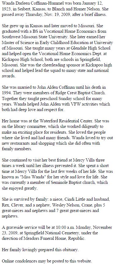 HARLAN H. NELSON (Source: Nelson- Brown Genealogy by Gladys Nelson Bremer.) was born August 17, 1878 in Knox Co., Missouri, and died March 26, 1942. He married ANNA ARCHIE LEAR September 1901 in Newark, Missouri. She was born December 03, 1880, and died July 14, 1936" Children of HARLAN NELSON and ANNA LEAR are: i. BRUCE VERNON NELSON, b. December 29, 1902, Knox Co., MO. ii. JAMES WILLIAM NELSON (Source: Nelson- Brown Genealogy by Gladys Nelson Bremer.), b. January 15, 1910. iii. MARY GRACE NELSON, b. March 05, 1912. iv. SAM LEAR NELSON, b. December 24, 1917, Flagler, Colo. |
