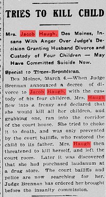 December 1907 "The domestic trouble of Mr. and Mrs. Jacob Haugh took a new turn