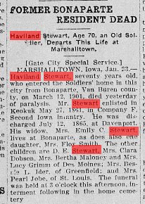 Haveiland Stewart 1837-1909 is buried in Van Buren County, # 28307511, with Emma Catharine (Mank) Steward 1848-1918.