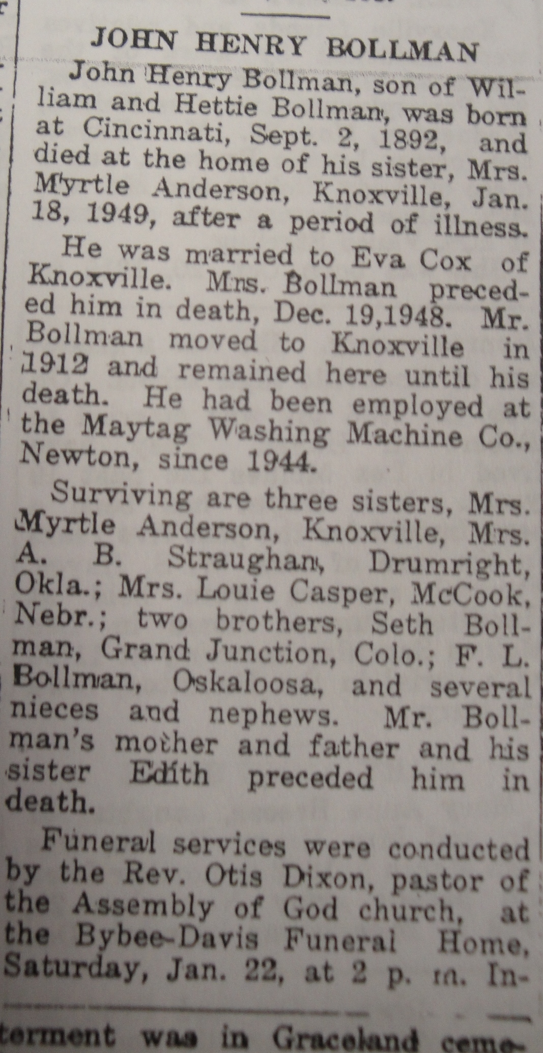 The Adams County Free Press Corning, Iowa August 25, 1920 A. M. Straughan died at the home of Dr. C. H. Bryant, in this city, Sunday evening, August 22, 1920, aged 68 years, 11 months and 8 days. The funeral services will be conducted from the Christian church at 2 o’clock this afternoon, Rev. E. C. Sitts, of Neola, Iowa, officiating. Interment will be made in Oak Hill cemetery. Mr. Straughan had been in fairly good health until July 3, when he was taken ill and went to a Creston hospital for treatment. Later he returned to the home of Dr. Bryant in order to be near his family physician for the necessary medical attention each day. The subject of this sketch was born on a farm in Mahaska county, three miles southeast of Peoria, Iowa, September 14, 1851. His mother died when he was 8 years of age, and his father three years later, after which he made his home with his eldest sister, Mrs. James Jarard, in Mahaska county. When he attained his majority he came to Fontanelle, Iowa, and worked on a farm until the spring of 1873, when he came to Adams county, which has ever since been his home. Mr. Straughan was married November 26, 1874, to Ada E. Humbert, and the couple settled on the farm a mile south of Corning, which has been the family home until the present time. Mrs. Straughan died April 30, 1910. To them were born two children both of whom are present to attend the funeral of their father. They are A. B. Straughan, of Mesa, Ariz. and Curt Straughan, of Corning. Beside these two sons there are two grand children and one great grandchild. Also deceased is survived by two brothers and two sisters. They are Mrs. James Jarard, of Oskaloosa; T. J. Straughan, Nardin, Okla.; J. W. Straughan, New Sharon, Iowa; Mrs. Sam Robison of Quincy. All but T. J. Straughan will be in attendance at the funeral. Deceased united with the Church of Christ in Corning October 17, 1915. One of the pioneers of the county, Mr. Straughan had led a busy life, blazing the way for the modern farm home of today. Always a great leader in the social and educational life of the community, his advice and example made better citizens where he lived. He was by nature and education a gentleman in the truest sense of the word, and the many hardships of the early days made him accustomed to self sacrifice. The soul of honesty, he believed that truth, right and justice would eventually prevail, and was optimistic even in the darkest hour. His love for his country was only surpassed by the ties binding him to his home. During the war he gave of his accumulations freely to his country, and not alone did he give money, but he encouraged the younger men in their sacrifices. His children and grandchildren will be left a memory of his stalwart character, which like a beacon light should lead them toward the goal the father had attained. When at the eventide the character of such a one stands out in relief so strongly against the setting sun of life, one almost feels that God’s plan for real manhood has been exemplified here. August 28, 1920 Last Sunday evening A. M. Straughan, better known as 'Mose' Straughan passed away at the home of Dr. C. H. Bryant of cancer of the porostrate [prostrate] glands, aged 68 years, 11 months and 8 days. His health had been very fair until July 3 when he went to a Creston hospital, but receiving no relief returned to Corning and had since been at the home of his physician where he could receive prompt medical treatment. He was born near Peoria, Iowa, where his mother and father died when he was 8 and 11 years of age. When a young man he came to Fontanelle and in 1873 came to this county which has since been his home and where he married Miss Ada E. Humbert November 26, 1874, who passed away April 30, 1910. To this union were born two sons, A. B. Straughan of Mesa, Arizona, and Curt Straughan of Corning and both were present at the funeral which was held from the Christian church of which the deceased was a member, Wednesday at 2 o’clock conducted by Rev. E. C. Sitts of Neola, Iowa, formerly pastor of the church Interment was made in Oak Hill cemetery. Mrs. A. M. Straughan died at her home south of Corning, Saturday morning, April 20, 1920 at 5 o’clock, aged 56 years and 10 days. Ada E. Evans was born in Clarkville, Clark county, Indiana, April 20, 1856 (1854). At the age of 2 years she came with her parents to Lucas county, Iowa, where they lived one year then moved to Adams county, locating on a farm near Brooks May 1, 1857, where she lived with her parents until 16 years age. She united in marriage to Joseph Humbert July 4, 1870, and they made their home on a farm one mile south of Corning. To this union was born one child Mrs. F. E. Gerald of Brooks, Iowa. After the death of Mr. Humbert April 6, 1873, she again lived with her parents, near Brooks, until November 26, 1874, when she was united in marriage to A. M. Straughan and they moved to the farm south of Corning. To this union two sons were born, Aug B. Straughan, of Seibert, Colorado, and Curt Straughan, of Corning. At the age of 18 years she united with the Church of Christ at Brooks, of which she was a faithful member till death. She passed away April 30, 1910, at 5 o'clock a.m. at her home south of Corning, leaving a husband, daughter, two sons; a sister, Mrs. O. F. Davis, of Camargo, Okla; and two brothers, Joseph O. Evans, of Creston, Iowa, and Charles M. Evans, of Straw, Mont., to mourn their loss. Mrs Straughan made may friends in Adams county during her long residence here and she will be remembered by all who knew her as a kind friend and neighbor and a patient sufferer during her long sickness. The funeral services were held Monday afternoon at 2:30 o'clock, at the Christian church in Corning, conducted by Rev. I. H Fuller, of Lenox, a former pastor of the Christian church in Corning, and interment was made in Oak Hill cemetery. The Royal Neighbors had charge of the service at the grave. Those from a distance who attended the fun