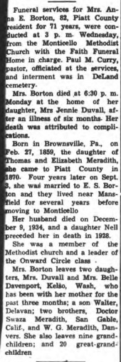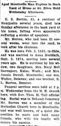 The body was brought to Monticello, where the funeral services were held Wednesday. Burial was made In the Deland cemetery. Mrs. Borton was born, Jan. 25, 1877, near Deland.