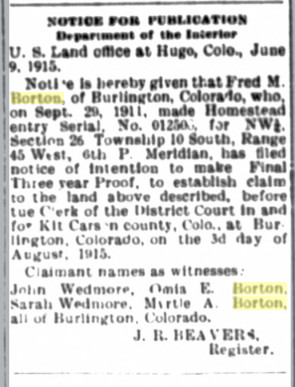 One family member wrote "Myrtle was born on 8 September 1881 in or near Unionville, Appanoose County, Iowa. She was baptized in the Methodist 'Church, Sloan Iowa. She died on 1 Oct 1971 in Jefferson, Marion County, Texas. A stone marks her resting place in the Berea 'Cemetery in Jefferson. She married Omia Earl Borton in Kanorado, Sherman County, Kansas on 19 June 1907. Yes, there was something about Onowa, IA. She was a school Teacher until her marriage, & she may have taught school there- a year or two (I cannot remember for sure). I am the grandaughter of John Wedmore and Sarah Jane Blair and I think I know more about them than any other member of of the family. " BORTON, Burnell, W., age 91, of Clio, passed away Thursday, February 11, 2010. Per his wishes cremation has taken place and no services are planned at this time. Burnell was born in Boulder, Colorado the son of Omer and Myrtle (Wedmore) Borton. He was a veteran of the US Army serving in WWII and had retired from General Motors. Survivng are; a son Mark (Mary) Borton of Clio, a daughter Peral Borton of Kentucky, 1 grandchild, 3 step-grandchildren and 3 great grandchildren. |