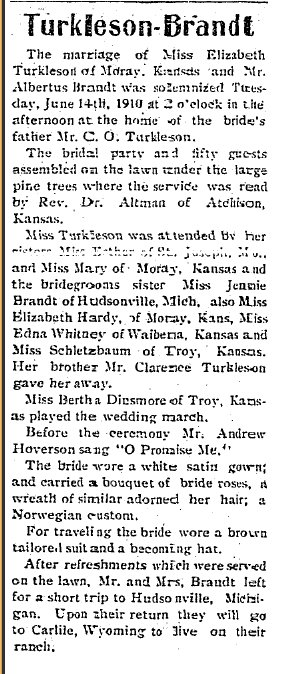 October 1975 "Mrs. Elizabeth Brandt, 99, Zion, Illinois, formerly of Doniphan county, died recently. She was are a son, Vinton Brandt, Waukegan Illinois , and one daughter, Chrystabel, of the..."
