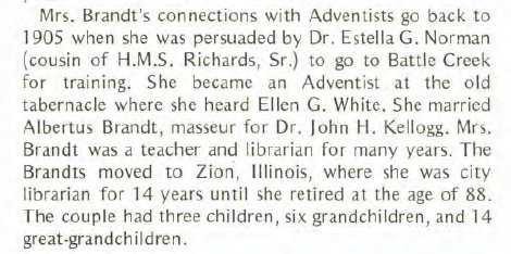 1914 Seventh Day Adventist "Brother Albertus Brandt, of Moorcroft, Wyo., sends a nice offering for missions. In his letter he states that Sister Brandt has just closed a seven months term of school , and would like to secure the services of some Adventist girl or woman who will help in the home and in caring for two small children while Sister Brandt is at the school."