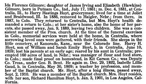 IDA Ida Florence Gilmore; m. Harry Hastings Hoyt. Harry proved up a quarter in 5, 7S 42W in 1893.