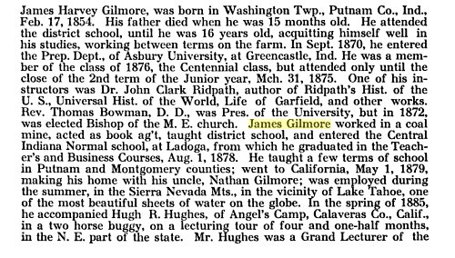 James Irving Gilmore b. probably in Preble Co., O., Oct. 10, 1829. After his parents' death, made his home with his cousin, Thomas Leech Gilmore, son of Thomas and Margaret Leech Gilmore. After the death of his cousin, he married Sept. 4, 1858, his cousin's widow, Elizabeth (Hawkins) Gilmore, who had been left with 8 young children. (In 1860 Putnam County, Elizabeth is 40, Wil 20, Emily 18, Jno 16, Benj 16, Mary J. 12, Ladassa 11, Andrew A. 8, Jas K. 6, Elisabeth 4, Frances 2. He lived on the farm in Putnam Co., until 1862, when he enlisted in the Civil war; was mustered into service in the 18 Battery, Ind., Light Artillery, Eli Lillie, Capt., Aug. 2, 1862, serving as wagon master; went with Sherman, to the sea; was never wounded, but suffered from the effects of the hardships, and privations, that he endured, for the rest of his life. He received an honorable discharge in 1865, and resumed the occupation of farming. He fought by his brother Joseph's side, and when he fell, carried him off the field, and buried him. (In 1870 Putnam County, Indiana, James Gilmore 50, and Elizabeth 50 have Mary 21, Andrew 18, Jane H. 16, Elizabeth 12, Fanny 10, Id 8, and Thomas 5. In 1878, the farm was sold, and Mr. Gilmore located in Furnas Co., Nebr., with H. P. Miller and wife, his niece, and her husband, and was joined by his family in 1880. They removed to Kit Carson Co., Colo., but returned to Beaver City, in 1900. (In 1900 Furnas County, Nebraska, James I. Gilmore is 69, Elizabeth C. 80, with T. Edgar 33, born Dec 1866 in Indiana. James Gillmore is 49, Elizabeth 57, both born in Ohio. Ella is 21, Ida 17.) Mrs. Gilmore d. May 10, 1901, aged 82 years. Mr. Gilmore entered the soldiers' Home, at Grand Island, Nebr. In 1904, he visited friends in Whittier, Calif., returned to the Home in 1905, and d. there July 9, 1909, aged 80 years. (Per # 39922407, Jas I. Gilmore was buried July 9, 1909) James Irving and Elizabeth Gilmore were the parents of 4 children. Martha Elizabeth Gilmore; m. Charles L. Lundy. ELLA Ella Francis Gilmore; m. Rev. F. F. Thomas. (Franklin F. Thomas married E. Frankie Gilmore in Furnas County August 28, 1884)