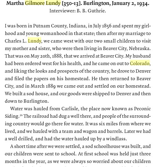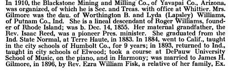 In 1928 when the airplane "Yankee Doodle" - Harry Tucker, owner, C.B. D. Collyer piloting, crashed southeast of Prescott, Arizona, "old Ed Gilmore's pack burros carried the bodies of the aviators over trails to the nearest road..." (In 1930 Yavapai County, Arizona, Thomas C. Gilmore is a gold miner, 64 , single, born in Indiana, lodging with Joseph and America Tomlinson. (In 1940 Yavapai County, Thomas is 68, boarding with the Maxwell and Jane Smith family) The death certificate says Thomas was born Dec 7, 1866 in Greencastle, Indiana, and died August 13, 1942 at the Yavapai County Hospital. He lived at the Brinkmeyer Hotel in Prescott, and was to be buried August 19 in Prescott.) MARTHA Martha Elizabeth Gilmore; dau. of James Irving and Elizabeth Christian (Hawkins) Gilmore; grand daughter of James and Betsey (Ramsey) Gilmore; and great granddaughter of William and Martha (Ochiltree) Ramsey; was born in Putnam Co., Ind., July 5, 1856. She attended the public schools; was a student in Ind. Asbury University; m. Charles Lyman Lundy, of Greencastle, b. in New Castle, Pa., May 30, 1849. (Charles L. "Lendy" married Martha "Gilman" in Montgomery County, Indiana on October 26, 1876) He was in the grocery business, in Illinois, located a homestead, in Kit Carson Co., Colo.; (Charles L. Lundy proved up a quarter in 28, 7S 42W in 1895.) served as Deputy Co. Clerk and Recorder, in 1895. ( In 1910 Kit Carson County, Charles is 60, born in Pennsylvania, managing a retail lumber yard, with Martha E. 53 and Roy G. 33, both born in Indiana. For 13 years, manager of Foster Lumber Co., at Hoxie, Colo.(Probably Kansas), Scott City, Kans., and Burlington, Colo., where he died March 11, 1915. Mrs. Lundy removed to Greeley, Colo., for better advantages for her children, but returned to the farm. The children of this family are: Roy Gilmore Lundy; b. in Greencastle, Nov. 3, 1877; served in the Spanish-American war, in the Philippines; returned to Colo. Claude McNally Lundy; b. in Centralia, Apr. 23, 1885; m. June 19, 1914, at Springfield, Colo., to Nelhe Baker, dau. of a merchant at Springfield, b. Apr. 1898. His father purchased a ranch near Springfield, stocked it with horses and mules, and put Claude in charge.