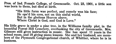 In 1900 they were in Greencastle " The death of Capt. Josiah Clinton Williams occurred Tuesday morning at two o'clock at his home on South Water Street [Greencastle]. About a week before, while attending the funeral of his sister, Mrs. Mary Bodle, he contracted a severe cold which terminated in pneumonia to which his death was due. "Captain Williams was born in Putnamville, sixty years ago, being the son of the late Worthington B. Williams. "In August 1861, Capt. Williams enlisted as a lieutenant in Company I, 27th Indiana Vols., and was later promoted to the captaincy of Company C of the same regiment and served through the entire war. At the time of his death he was Adjutant of Greencastle Post No. 11, G.A.R. Surviving him are two brothers, Worth Williams, of this city, and Frank Williams of Putnamville, and Mrs Thos. Williams [sic, should be Williamson] of California and Mrs James Gilmore and Miss Edistina Williams of this city." |