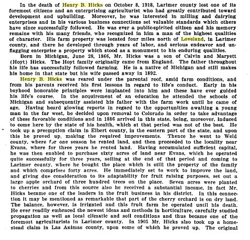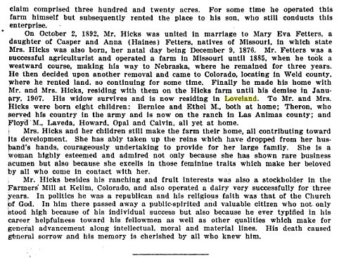 Henry B. Hicks Jr. was a namesake of his grandfather, the late Henry B. Hicks Sr., and the second son born to Calvin Clark Hicks and Maryette Hoyt-Hicks. His birth occurred on June 28, 1866 in east Cooper Township, Kalamazoo County, Michigan. His first schooling was in the "Little Red Schoolhouse" on the Kalamazoo-Plainwell river road. When Henry was about ten years old the family removed to the Springbrook farm in Richland Township, on the old state road, and so long afterwards owned by his father. When still in his teens, Mr. Hicks showed signs of impending poor health and his doctor advised him to go west, a change of climate apparently being what he needed. And now we relate here some of the interesting experiences that followed, as related by his widow and in Henry's own language. At the age of twenty-one and after the fall work of 1887 was done on my father's farm, I decided to take my doctor's advice and I prepared to leave for Colorado. That state was then now being opened to homesteaders. This was quite an undertaking for one who had been sick so much and away from home so little, but I was determined that I must have my health. I had become much interested in poultry raising and by these means I had saved up some money. As I was getting ready to leave my father said to me, "Well, Henry I am giving you just two weeks to be back home again, as you will have your money all spent by that time." I had been corresponding with my cousin S. Elmer Hicks, who was living on a homestead fourteen miles from Burlington, Colorado, and had made arrangements for him to meet me at Hegler (Haigler), Nebraska, as that was the nearest railroad station at that time, and was about sixty miles from Elmers. He was hauling freight and had to leave before my train arrived, so this was my first disappointment. I went to the boarding house and engaged a room and learned Elmer had left word when he would be back. I was anxious however; to get to the end of my journey and decided to try other means to get there. I found a fellow who was going as far as Jack-way (Jaqua), Kansas and I made arrangements to ride with him. As we neared this little town the sights that befell my eyes were appalling. Grocery store, drug store, saloon, and post office sign above the little wooden shacks. My thoughts drifted back to Springbrook, Kalamazoo County, Michigan and the good friends I had just left. I was struck with a severe case of "home sickness." I went to the hotel, so called, but which was just another shack with a saloon and the office in one. I engaged my room and had supper and then retiring to my room I sat down and cried like a child, and had it not been for the remarks my father made when I was leaving, I would have turned back, but instead I decided to brace up and continue my journey. While eating breakfast the next morning, I chanced to meet a couple young fellows who were going my way and I arranged to ride with them. After riding over the rough prairie country for some time, we turned to see the sheriff coming on a speedy saddle horse. One of the boys shouted "There he comes," then, they commenced to use the whip on our horses. Imagine the thoughts of a green farmer boy from the quite peaceable law-abiding Michigan. I realized then and there that I was in the "wild and woolly west", and I expected every minute to see gun play with the bullets whizzing past my head. It was the fastest and wildest ride I ever took behind two horses, but the sheriff's wiry steed was too much for them and soon he dashed up beside us and called out. "Well boys, I've got you." Well it developed that the boys were wanted in a court case in which they did not want to appear, and were trying to get across the state line. "A Western Trick," but the sheriff beat them and served his summons. By this time my heart was going pit-a-pat, but now I commenced to feel much better when I learned what all the excitement was about. We went on and I reached Elmer's late that afternoon. He was batching it in homesteader style, and got us a very good supper that evening, but I guess he forgot to sift the flour for his biscuits. Anyway, I cracked a perfectly good tooth in my efforts to master one however. I managed not to let him know it. Yes, I was in the West, and I felt much like a foreigner in a foreign land. Everything was new to me, but I was gradually getting aquainted and becoming accustomed to it. After a while I decided to file a claim and did. Five of us fellows batched it that winter and we had some lively times too. At one time I had two correspondents, friendly and relation, although I endured many hardships, my health which I so much desired was gradually improving and that made me happy. So I lived in hopes of some day being well again. Finally after about two and a half years, I got a letter from my brother Theodore telling me that he was to be married and he wished me to come home so that we could be "boys" just a while before the event of his marriage. I returned to Michigan and stayed about six months, but my health again commenced to fail, so I returned to Colorado and lived alone for some time on my claim. But not long after I chanced to meet Mary Fetters, born 12-9-1875, a native of Missouri. The sweet lady who since October 2nd, 1892, has been my faithful wife and companion and has proved the luckiest break of my life. In the fall of 1894, we sold out and moved farther west near Grealy (Greeley) , Colorado. Again in 1901, we sold this place and moved to our present farm near Loveland, Colorado. (Loveland is about 50 miles west of Denver). During this time eight healthy children have been born to us, four boys and four girls: Bernice Myra, Ethel Myrtle, Theron Lawrence, Floyd Marvle, Laveda Irene, Howard Virginia, Ople Fern, and Calvin Delbert. Every one of our children have been our joy and our pride, and it has always been our greatest aim in life to bring them up in a God fearing Christian home. All at this writing are happ