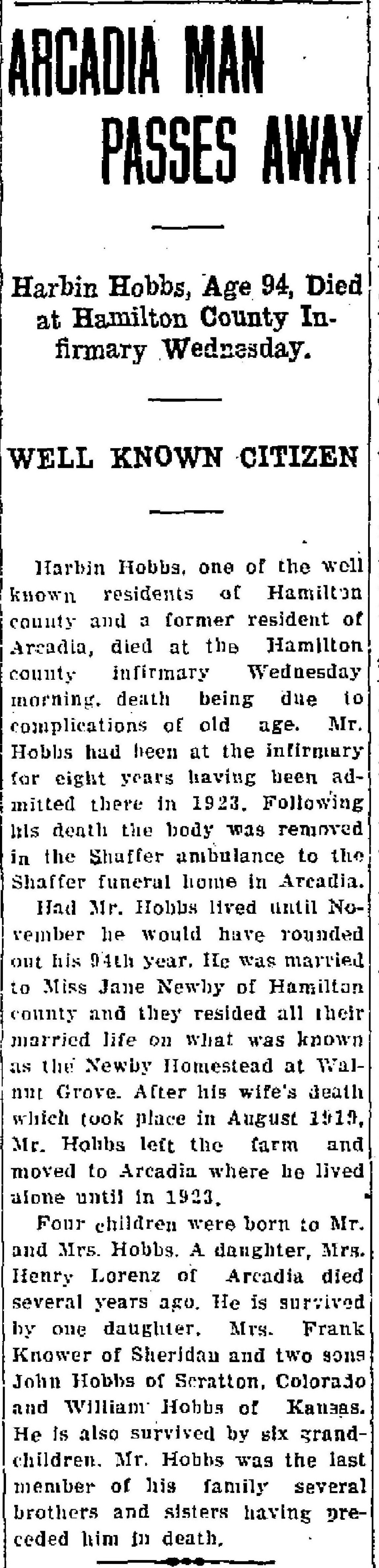 William Elmer Hobbs was born Sept 10, 1869 to Harbin Hobbs and Jane Newby, and died in Barton County, Missouri April 26, 1938, to be buried in Greenfield Cemetery.